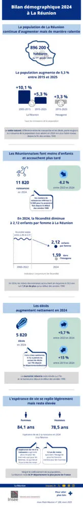 Au 1er janvier 2025, la population réunionnaise est estimée à 896 200 habitants. La croissance démographique ralentit en lien avec un solde naturel au plus bas.