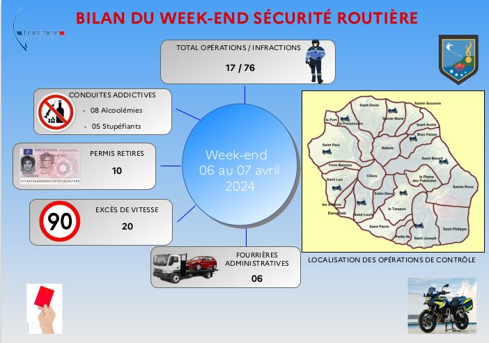 Les effectifs de la Direction Territoriale de Police Nationale de La Réunion ont réalisé sur le département 45 opérations de sécurisation et de sécurité routière au cours de ce week-end du 05 au 07 avril 2024, permettant de relever 265 infractions, dont 39 délits :