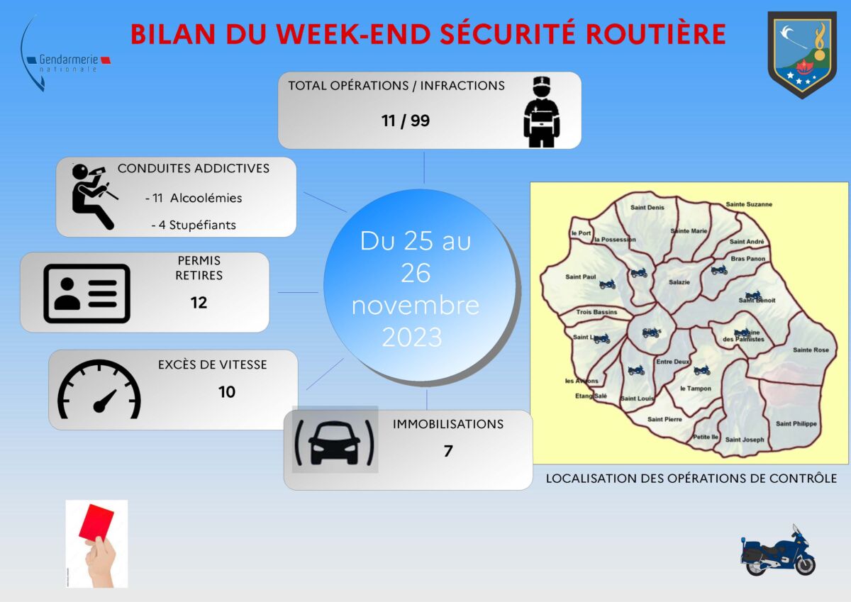 Les effectifs de la Direction Territoriale de Police Nationale de La Réunion ont réalisé, sur le département, 21 opérations de sécurisation et de sécurité routière au cours de ce week-end du 24 au 26 novembre 2023, permettant de relever 78 infractions, dont 28 délits :