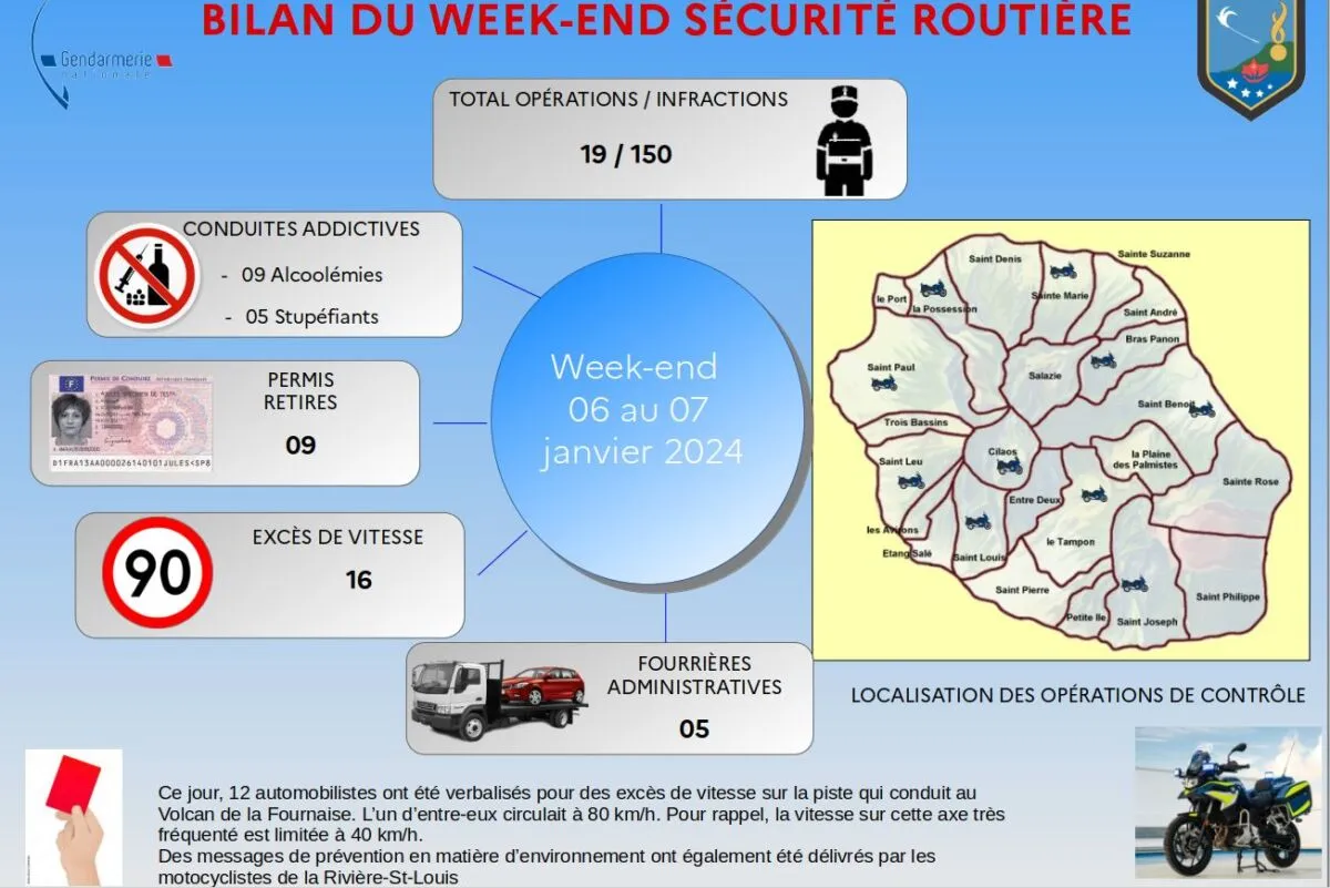 Les effectifs de Police de la Direction Départementale de la Sécurité Publique de La Réunion ont réalisé sur le département 39 opérations de sécurisation et de sécurité routière au cours de ce week-end du 05 au 07 janvier 2024 permettant de relever 110 infractions soit 24 délits dont :