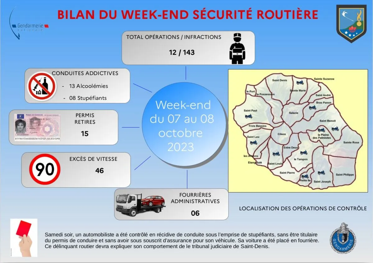 Les effectifs de la Direction Territoriale de Police Nationale de La Réunion ont mené 46 opérations de sécurisation et de sécurité routière dans le département au cours du week-end du 06 au 08 octobre 2023, ce qui a permis de constater 360 infractions, dont 29 délits.