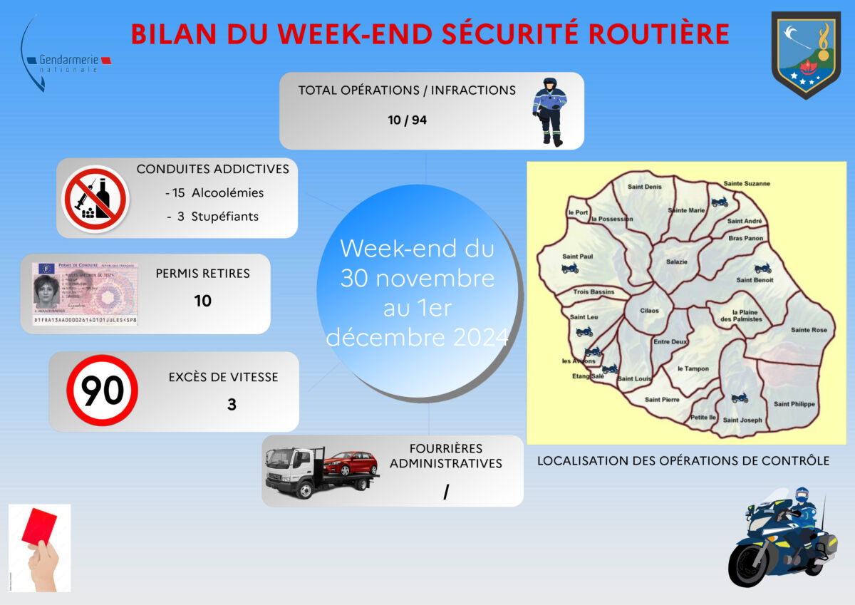 Les forces de la gendarmerie ont intensifié leurs opérations de sécurité routière sur l’ensemble de l’île ce week-end, du 30 novembre au 1ᵉʳ décembre 2024, pour prévenir les comportements dangereux et garantir la sécurité des usagers.