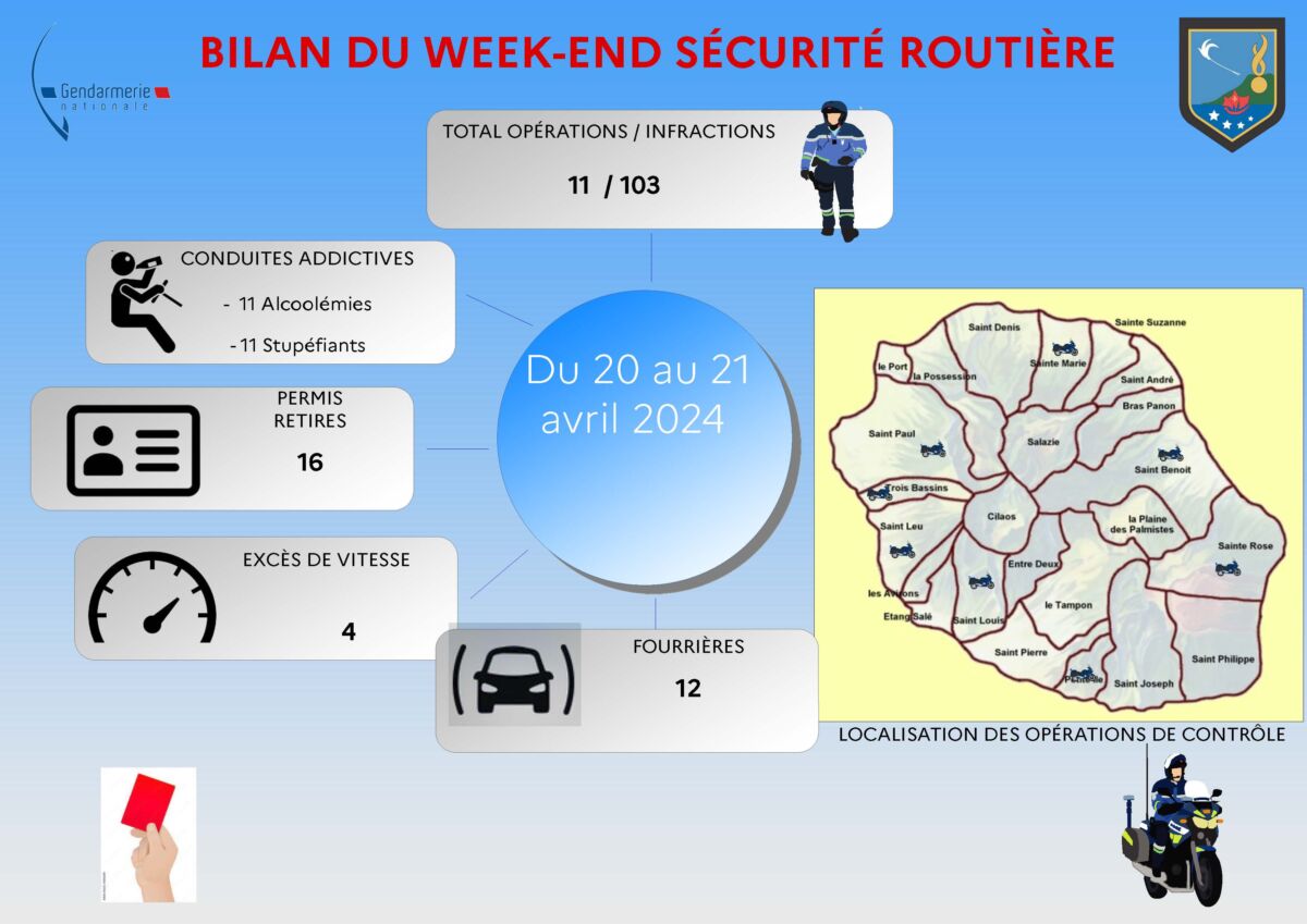 Les effectifs de la Direction Territoriale de Police Nationale de La Réunion ont mené 37 opérations de sécurisation et de sécurité routière dans le département ce week-end du 19 au 21 avril 2024, conduisant à la constatation de 187 infractions, dont 20 délits. Parmi ces délits, on compte :