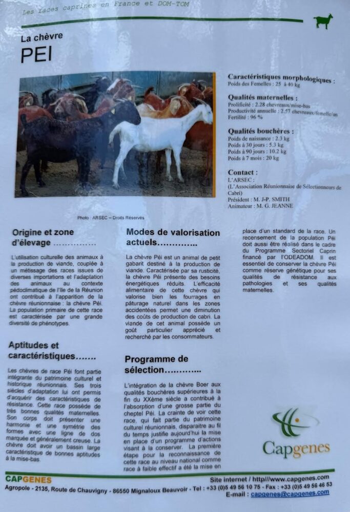 Concernant le cabri péi. L’aide est également de 500€ par tête de bétail répartie ainsi : 412 € pour compenser les surcoûts de production; 48€ pour le développement de nouveaux réseaux de commercialisation/valorisation. Budget prévisionnel pour le Département : 153 000 €.