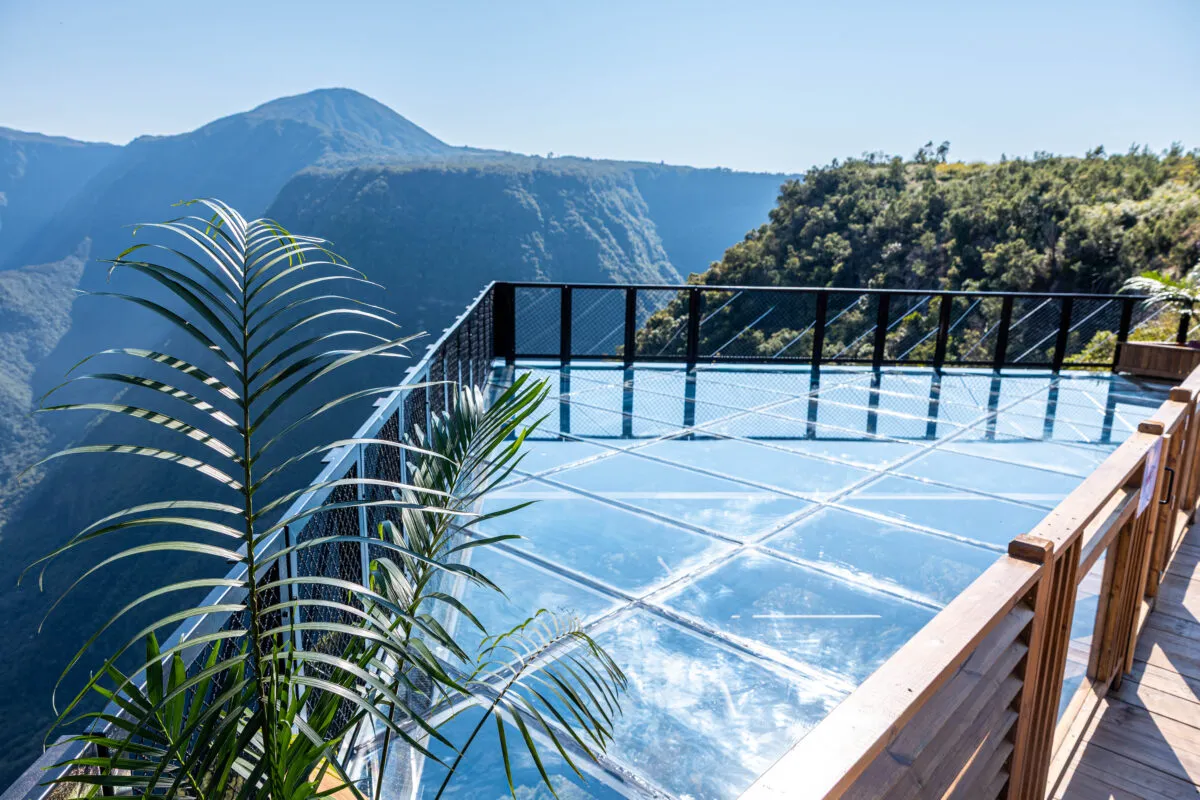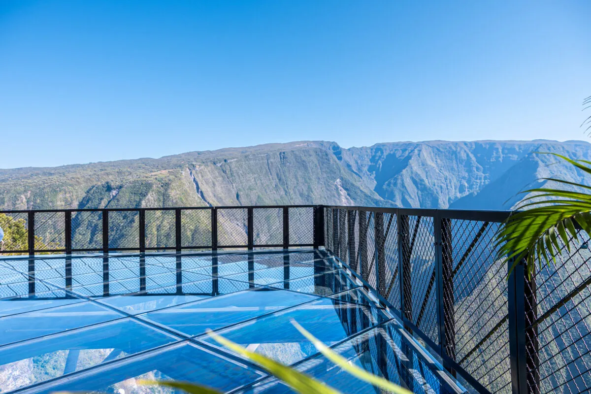 Il s’agit de la première plateforme panoramique vitrée conçue sur un site touristique à La Réunion. Initialement en bois, l’ancienne structure a été entièrement repensée pour offrir une expérience vertigineuse et immersive, en toute sécurité. Le plancher vitré repose désormais sur une structure renforcée, adaptée aux contraintes de charge liées au matériau et à l’affluence attendue.