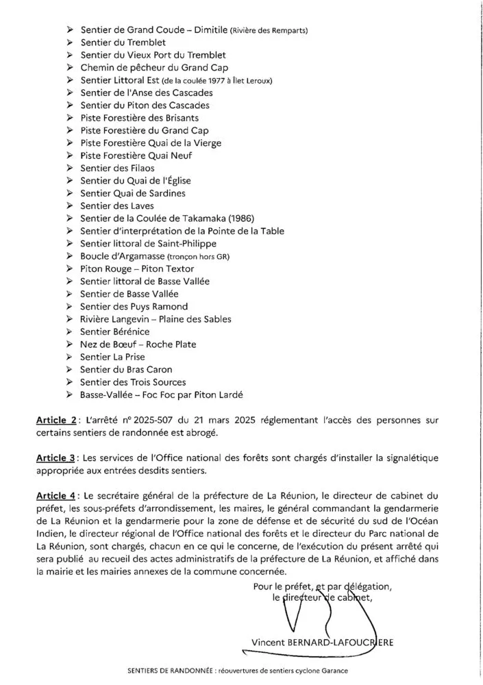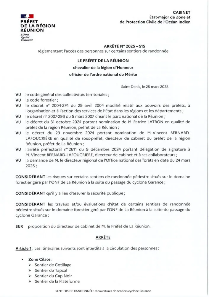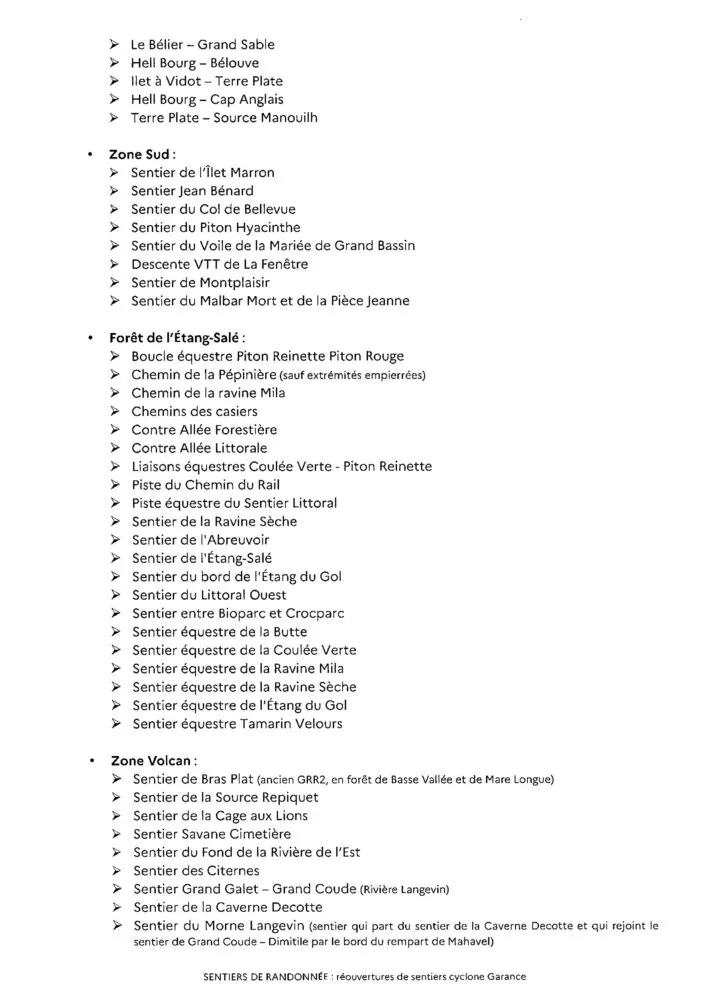 Suite aux travaux et/ou évaluations d’état de certains sentiers de randonnée pédestre situés sur le domaine forestier géré par l’ONF de La Réunion à la suite du passage du cyclone Garance, certains sentiers peuvent être rouverts. C’est le cas notamment des sentiers du Taïbit, de Ti Col – La Brèche, du Col de Fourche, de la partie haute du sentier du Colorado (de la boule météo au kiosque d’Affouches) ou encore du sentier de la Chapelle à Cilaos.