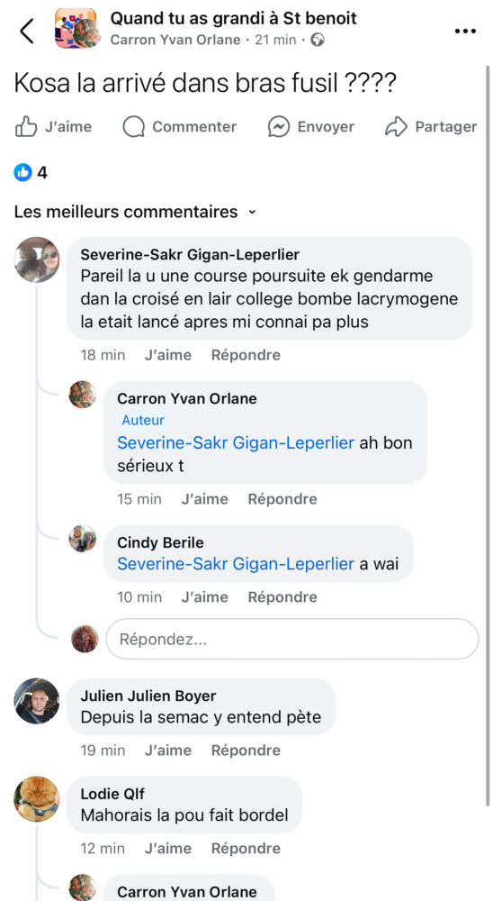 5. Un camion de gendarmerie brûlé mais tout va bien! La dernière fois qu’un camion des forces de l’ordre a été brûlé, aux feux de Bras Canot, c’est quand Selly était adjoint à la Politique de la Ville! Maintenant qu’il est Maire, c’est rebelotte! Dès qu’il gère, c’est le caillassage! Il n’y a aucune efficacité des services de la Ville sur Bras Fusil! Et pourtant, ils ont fait venir un zoreil de Mayotte qui gérait la délinquance là-bas! On dirait que ça empire! L’insécurité monte! La population a peur! Une course poursuite, avec des balles perdues qui peuvent nous toucher! Même les forces de l’ordre ont dû fuir! Selly dédramatise mais la situation est extrêment grave! Les habitants sont en danger!