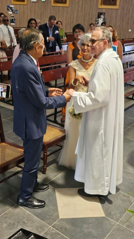 Après le renouvellement des vœux et la relecture de l’acte de mariage, ce dimanche, le curé de la paroisse a procédé à la bénédiction des alliances. Jean et Jacqueline Atchapa, respectivement originaires de Saint-Benoit et de Saint-André résident à Bras-Panon depuis leur mariage, il y a 60 ans. L’histoire de leur rencontre fut assez comique. C’est Jacqueline Lo-Song (son nom de jeune fille) qui la raconte non sans sourire : « J’étais en 3ème au collège Joseph Bédier à Saint-André; A chaque fois que j’allais au collège, je voyais qu’un monsieur me regardait. Il était enseignant à l’école primaire, pas très loin du collège. Il me regardait passer du haut de la fenêtre de son école. J’ai appris plus tard, qu’il avait fait un pari avec un de ses collègues, Monsieur Gaudens, en disant que cette petite mamzelle me plaît. Mais son collègue lui avait dit de ne surtout pas faire ça car le papa de cette jeune fille n’est pas très commode et ou va gagne coup d’ fusil si ou cherche à elle… ».