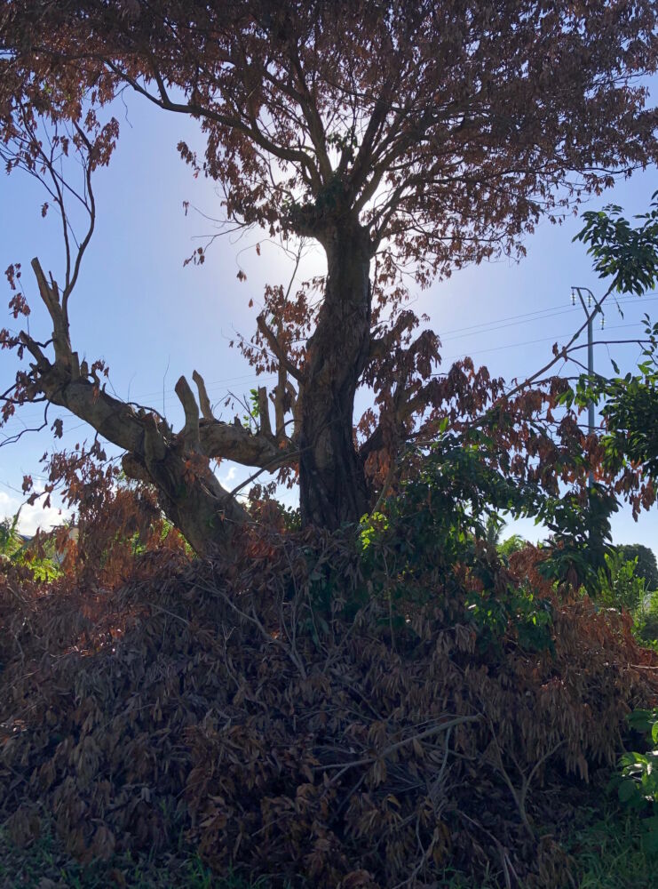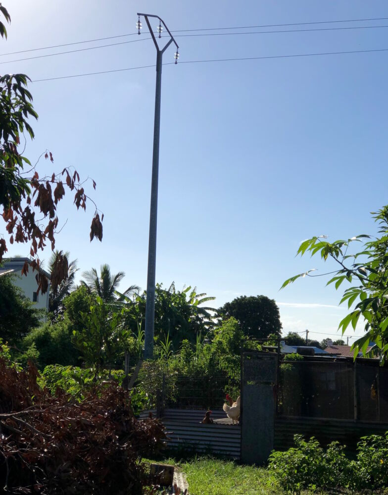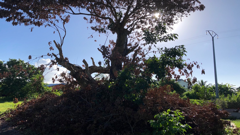 « A plusieurs reprises, par temps d’orages, la foudre est tombée dans les cours avoisinantes, soit sur un arbre, soit dans une piscine. Le pied de letchis que vous voyez là est centenaire. Il a littéralement été grillé par le tonnerre. Des voisins ont déjà vu des boules de feu sur la ligne haute tension qui passe juste au-dessus de nos maisons », précise une dame qui habite dans le secteur.