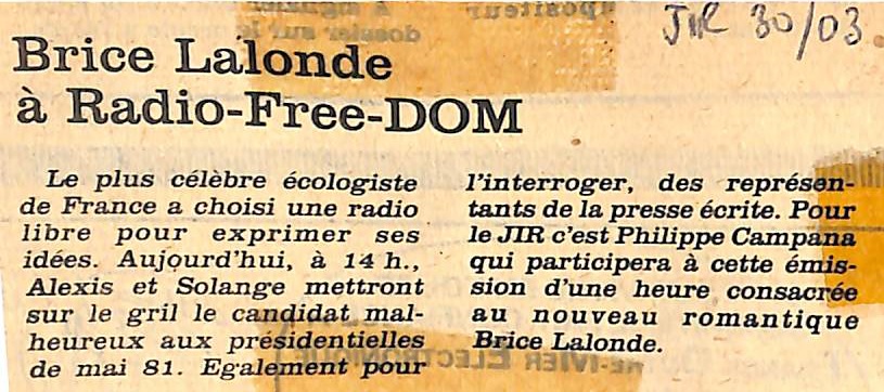 1982 Brice Lalonde interrogé par Alexis, Solange et Philippe Campana du JIR par La Rédaction 30 mars 1982 1 min de lecture Ne manquez pas toute l’actualité de La Réunion ! Abonnez-vous à la newsletter de Free Dom ! Valider Partager Facebook Twitter Pinterest Linkedin Whatsapp Reddit Email Vous pourriez être intéressé par 10 décembre 1982 Un canular par jour sur Radio Free Dom 11 octobre 1982 L’émission « pas de canard sans navet » 7 octobre 1982 L’émission « bleu outre-mer ou la radio de la méduse… » La Rédaction Laisser un commentaire Annuler la réponseYour email address will not be published. Enregistrer mon nom, mon e-mail et mon site dans le navigateur pour mon prochain commentaire. Current ye@r * Leave this field empty Article précédent « Fleurs de Bourbon » par Solange Pieplu Article suivant Brice Lalonde sur Free Dom Articles récents... Mercredi 31 décembre 2025 – Météo, éphéméride et horoscope du jour Hommage à Johnny Hallyday sur Free Dom 2 ce 5 décembre Mardi 30 décembre 2025 – Météo, éphéméride et horoscope du jour Saint-Joseph : découverte de 2337 plants de cannabis, arrestation de 2 individus Point sur le réseau routier départemental, 29 décembre à 16H30 Suicide sur le pont de la Rivière d’Abord : importante mobilisation des secours et des forces de l’ordre Radier submergé à Ilet Furcy : la route de Cilaos fermée à la circulation cette nuit Fortes pluies : appel à la plus grande prudence à Saint-Paul Saint-Gilles-les-Bains : une route impraticable, les riverains montent au créneau (VIDEOS) Très grands excès de vitesse : un délit passible de prison depuis le 29 décembre 2025