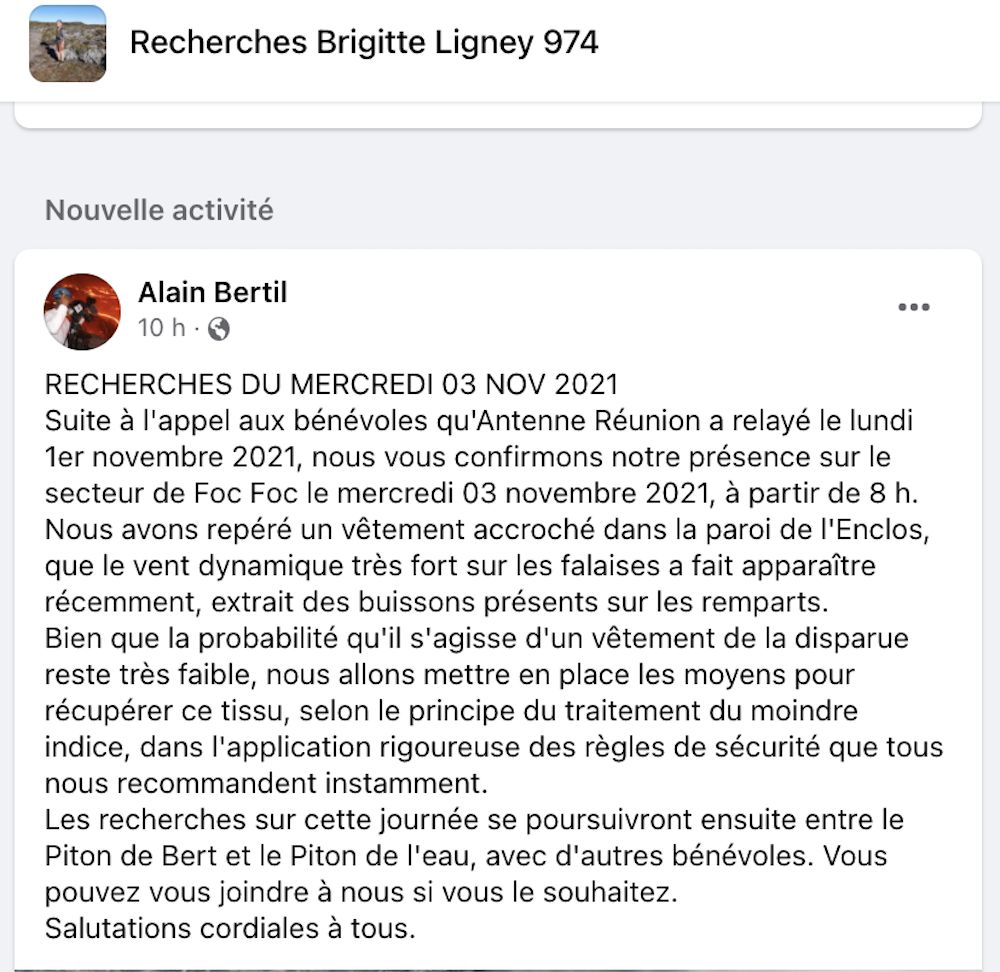 Début novembre 2021, des bénévoles se sont rendus sur les sentiers du Piton de Bert et du Volcan, dans l’espoir de retrouver la trace de Brigitte Ligney, la maire de la commune de la Chenalotte en métropole.