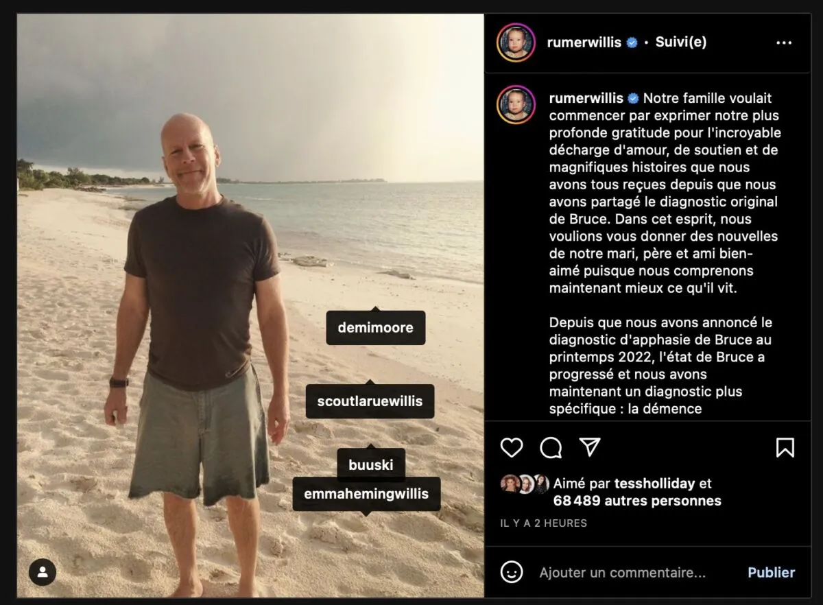 Bruce a toujours trouvé de la joie dans la vie – et a aidé tous ceux qu’il connaît à faire de même. Cela a fait pour le monde de voir que le sentiment de soin faisait écho à lui et à nous tous. Nous avons été tellement émus par l’amour que vous avez tous partagé pour notre cher mari, père et ami pendant cette période difficile. Votre compassion, votre compréhension et votre respect continus nous permettront d’aider Bruce à vivre une vie aussi complète que possible.