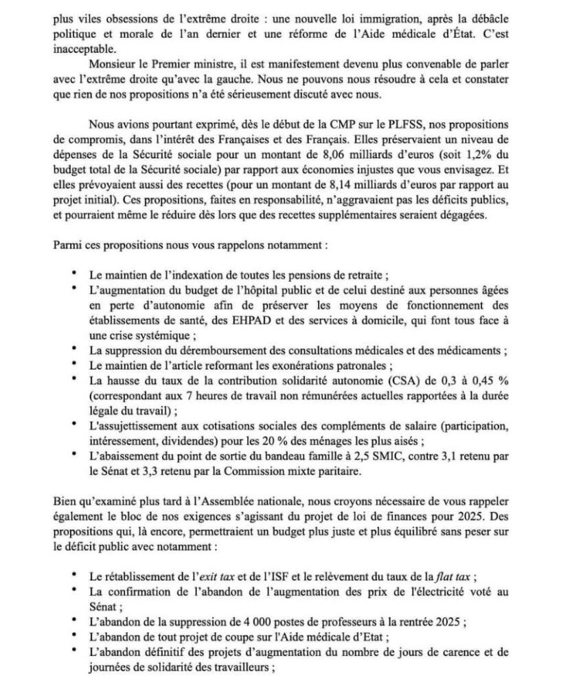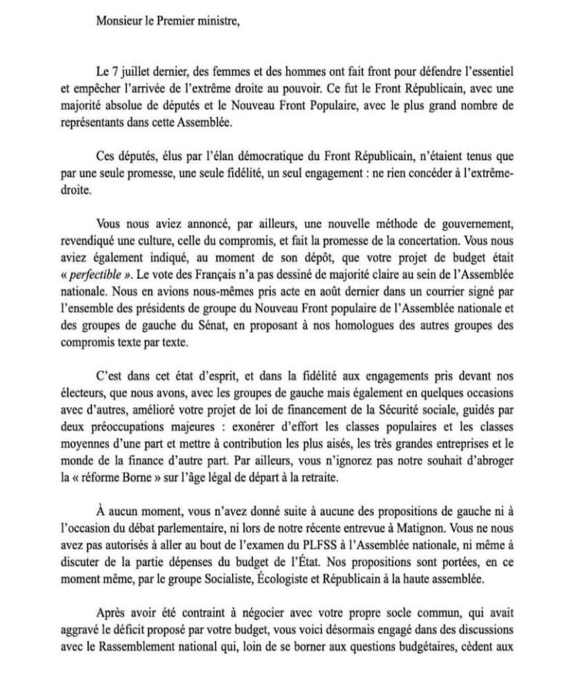 Olivier Faure, premier secrétaire national PS (complètement à droite sur notre photo de Une), Boris Vallaud, président du groupe Socialistes et apparentés à l’Assemblée nationale et Patrick Kanner, président du groupe Socialiste, écologiste et républicain du Sénat ont écrit au Premier ministre Michel Barnier. « En l’absence de tout compromis, l’intransigeance du bloc macronistes-LR et l’adoption du budget via l’art 49.3 », ils expliquent le choix du Parti Socialiste de voter la censure du gouvernement
