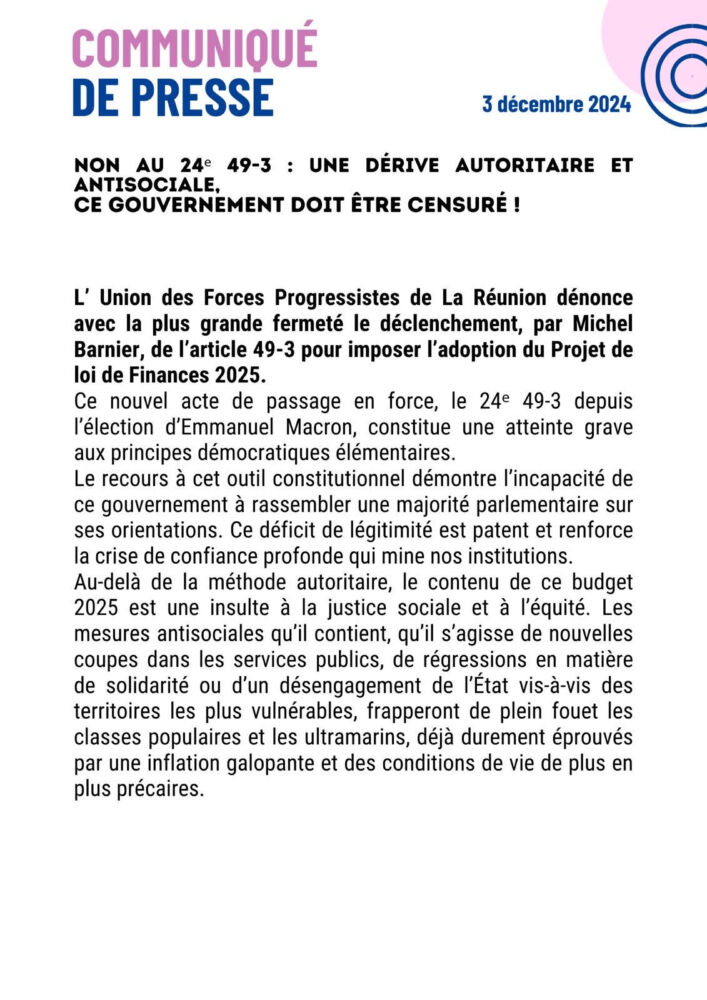 Dans la foulée, LFI (La France Insoumise) a présenté une motion de censure au nom du Nouveau Front Populaire (NFP); Laquelle sera également votée par le Rassemblement National, comme l’a fait aussitôt savoir le Parti de Marine Le Pen, qui va lui aussi déposer une motion de censure. Une double motion de censure donc contre le 49-9 de Michel Barnier. « Michel Barnier n’a pas souhaité répondre aux demandes de 11 millions d’électeurs du Rassemblement National, nous assumerons les nôtres; Nous déposerons une motion de censure; Nous voterons les motions de censure et, en premier lieu, la nôtre », a déclaré Marine Le Pen.