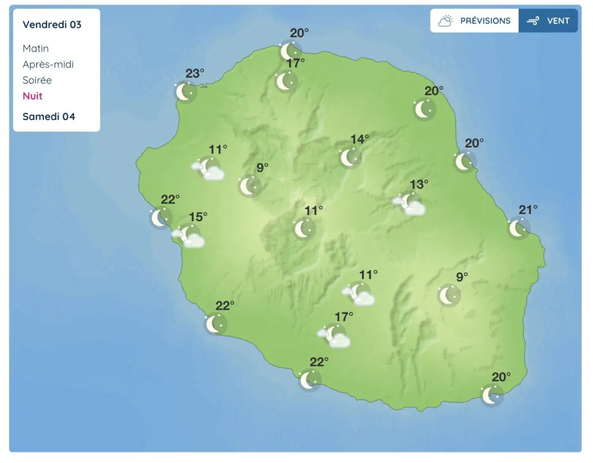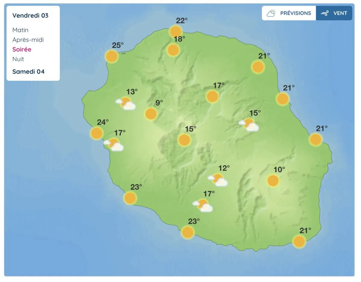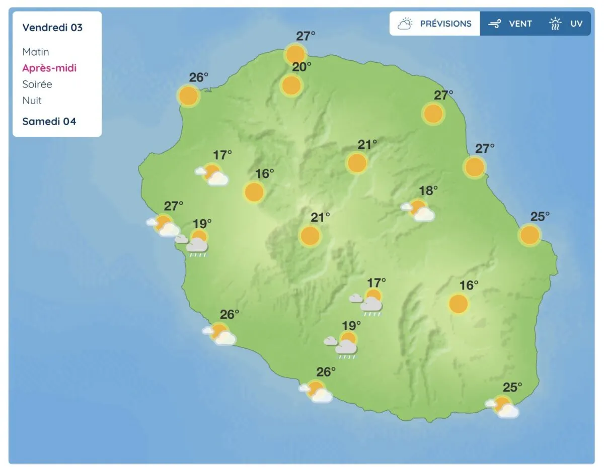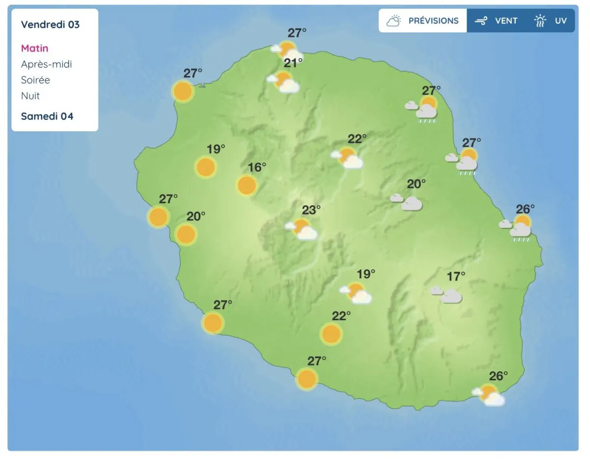 Matinée – Ciel souvent nuageux sur les façades Nord et Est avec quelques petites averses passagères, plus marquées des pentes de Sainte-Marie à Sainte-Rose et vers le massif du Volcan. À l’Ouest et sur le Sud sous le vent, larges éclaircies dès les premières heures.