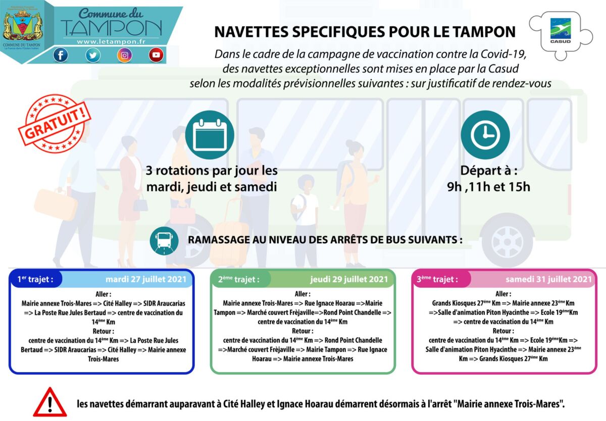 Collectivités/Le Tampon Campagne de vaccination : le planning des navettes gratuites au Tampon par La Rédaction 26 juillet 2021 1 min de lecture Dans le cadre de la campagne de vaccination contre la Covid-19, des navettes gratuites sont mises en place. Voici le planning du 27 au 31 juillet : Ne manquez pas toute l’actualité de La Réunion ! Abonnez-vous à la newsletter de Free Dom ! Valider Partager Facebook Twitter Pinterest Linkedin Whatsapp Reddit Email Catégorie: vaccination Vous pourriez être intéressé par 29 décembre 2025 Point sur le réseau routier départemental, 29 décembre à 16H30 29 décembre 2025 Fortes pluies : appel à la plus grande prudence à Saint-Paul 29 décembre 2025 Intempéries : radiers submergés à Trois Bassins et à Saint-Paul La Rédaction Laisser un commentaire Annuler la réponseYour email address will not be published. Enregistrer mon nom, mon e-mail et mon site dans le navigateur pour mon prochain commentaire. Current ye@r * Leave this field empty Article précédent Bientôt un KFC, déjà un nouveau DGS et retrait des délégations à la 2ème adjointe : le maire de St-André fait le point (VIDÉO) Article suivant Bras-Panon : un concours canin organisé ce week-end ! Articles récents... Hommage à Johnny Hallyday sur Free Dom 2 ce 5 décembre Mardi 30 décembre 2025 – Météo, éphéméride et horoscope du jour Saint-Joseph : découverte de 2337 plants de cannabis, arrestation de 2 individus Point sur le réseau routier départemental, 29 décembre à 16H30 Suicide sur le pont de la Rivière d’Abord : importante mobilisation des secours et des forces de l’ordre Radier submergé à Ilet Furcy : la route de Cilaos fermée à la circulation cette nuit Fortes pluies : appel à la plus grande prudence à Saint-Paul Saint-Gilles-les-Bains : une route impraticable, les riverains montent au créneau (VIDEOS) Très grands excès de vitesse : un délit passible de prison depuis le 29 décembre 2025 Fermeture temporaire du sentier de la Canalisation des Orangers (cirque de Mafate)