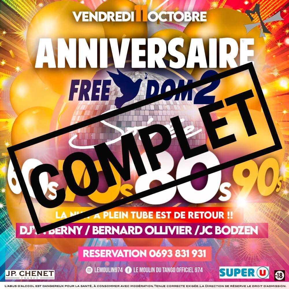 Ce 11 octobre, soirée exceptionnelle avec le Free Dom 2 au Moulin du Tango à Saint-Gilles ! Les DJ’s Berny, Bernard Ollivier et JC Bodzen vous ont fait danser l’assistance sur les plus grands tubes des années 60, 70, 80 et 90. La soirée a débuté dès 19h30 avec l’orchestre Tropikaddanse qui a laissé place à l’ambiance explosive des DJ’s à 22h30 . Vous avez été accueillis avec une coupe de JP Chenet et un cadeau surprise Free Dom 2.