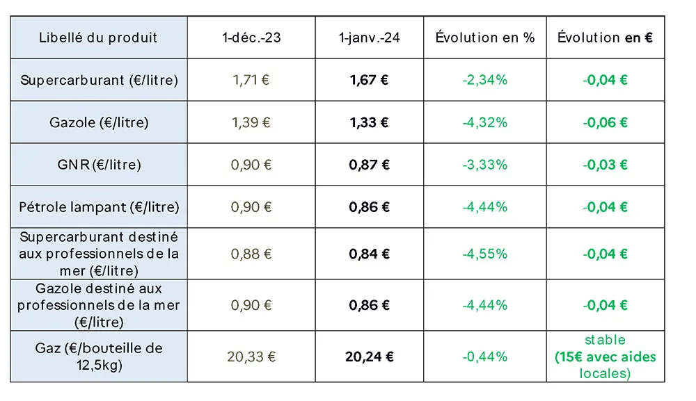 Au 1er janvier, le prix de vente maximum du super sans-plomb diminue de 4 centimes et celui du gazole de 6 centimes. Le prix de la bouteille de gaz est maintenu à 15 euros avec les aides locales.