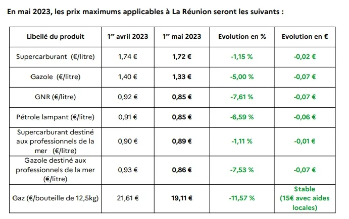 Au 1er mai 2023 : le prix du gazole diminue de 7 centimes et celui du super sans-plomb de 2 centimes. La poursuite de l’aide des collectivités locales maintient le prix de la bouteille de gaz à