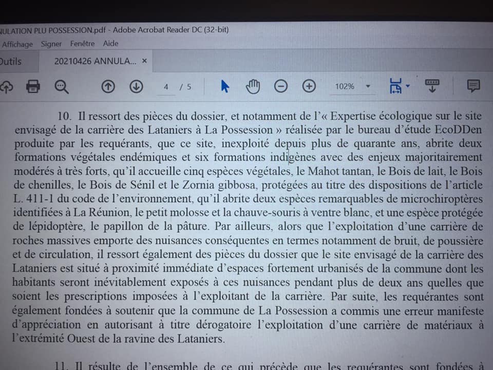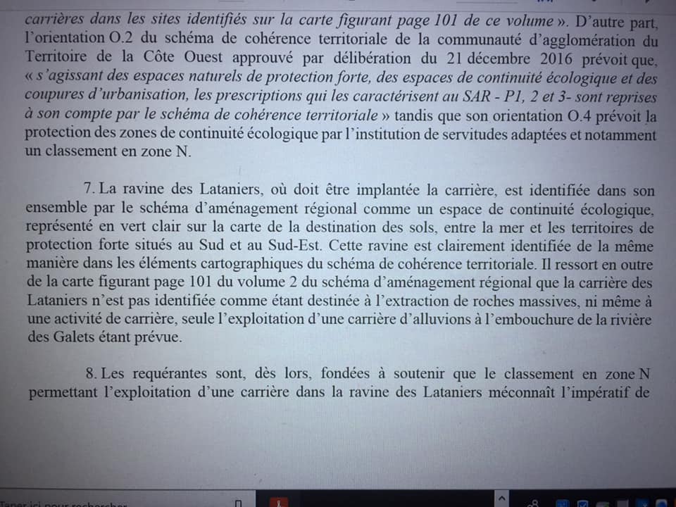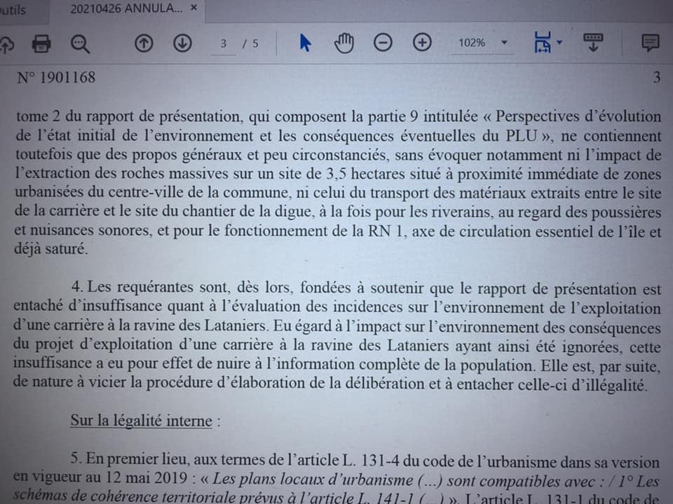 En clair, la partie de la révision du PLU de 2019 qui permet l’exploitation d’une carrière sur le site des Lataniers est annulée!!