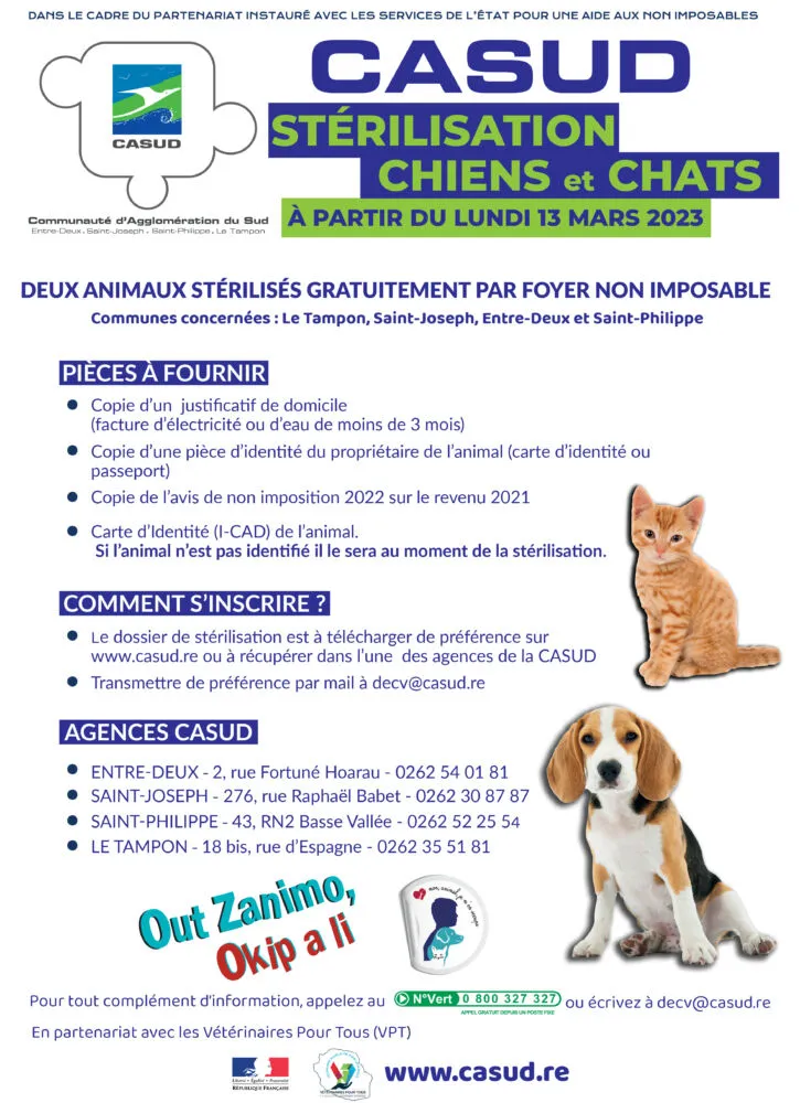 Les foyers non imposés, des communes du Tampon,  de Saint-Joseph, Saint-Philippe et de l’Entre-Deux pourront ainsi faire stérilisés gratuitement jusqu’à deux animaux (chats/chiens) mâles ou femelles, et ce dans le cadre du partenariat avec les services de l’Etat.