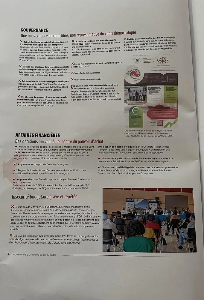 Le « Livre Noir » se présente comme un bilan critique du mandat en cours, soulignant les trois années de gestion jusqu’en 2026. Les élus mettent également en avant des problèmes liés à l’élection municipale de 2020 et aux élections intercommunales qui ont suivi en soulignant des démarches contestées et des résultats controversés. Ils appellent donc la population à demander des comptes et à exiger des changements. Et même s’ils expriment clairement leur volonté de collaborer, ils conditionnent désormais leur participation à la volonté de l’autre côté de prendre des décisions dans l’intérêt exclusif de la population.