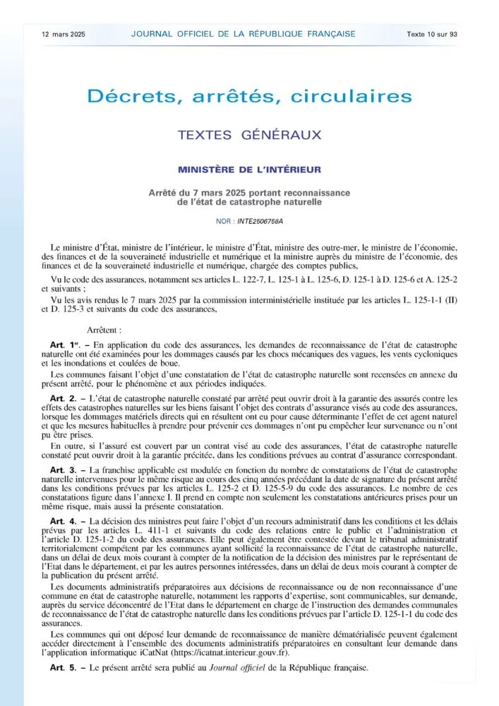 L’arrêté interministériel portant reconnaissance de l’état de catastrophe naturelle suite au passage du cyclone GARANCE a été publié au journal officiel (JO) du 12 mars 2025 et concerne l’ensemble du territoire de La Réunion. Cet arrêté issu de la procédure accélérée octroie la reconnaissance de catastrophe naturelle pour les 24 communes de La Réunion, pour au moins un aléa.