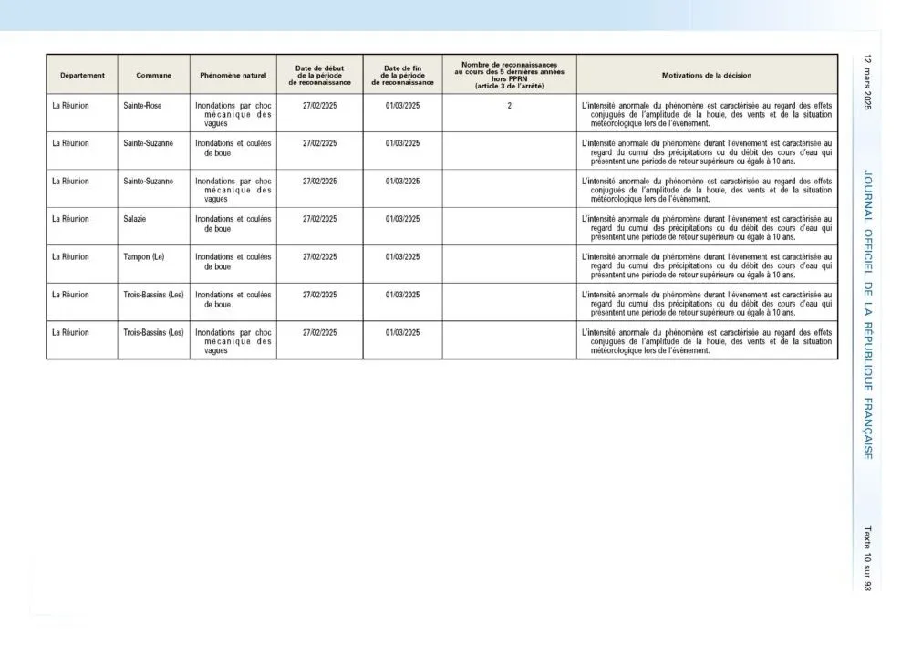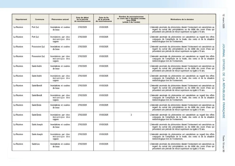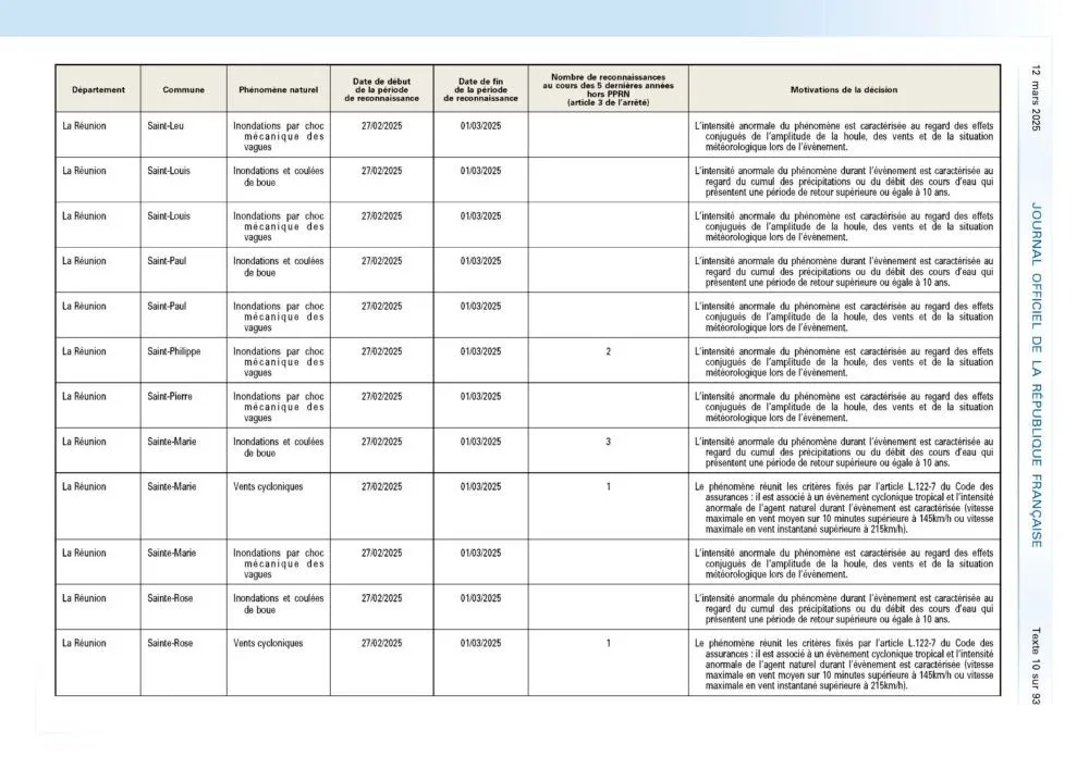 L’arrêté du 7 mars 2025 portant reconnaissance de l’état de catastrophe naturelle suite au passage du cyclone Garance sur La Réunion a été publié ce mercredi 12 mars au Journal Officiel. À sa lecture, j’ai été totalement stupéfait et déçu de constater que toutes les communes lourdement impactées n’étaient pas logées à la même enseigne.