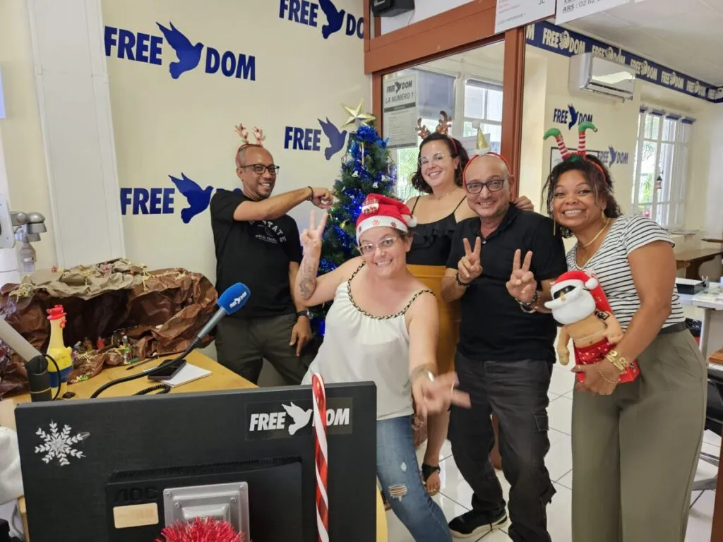Ce matin, petite pause festive au Son du Soleil. Entre deux moments d’antenne, l’équipe s’est retrouvée autour du sapin et de la crèche Free Dom pour une photo pleine de sourires et de bonne humeur. Bonnets de Noël, serre-têtes rigolos,