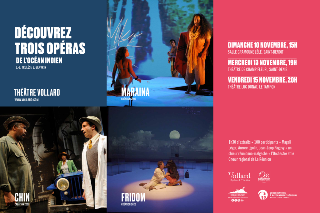 Le Théâtre Vollard vous invite à une expérience unique avec trois opéras emblématiques : Maraina, Chin et Fridom, des œuvres qui marient avec brio l’histoire, la culture et les émotions de la région.