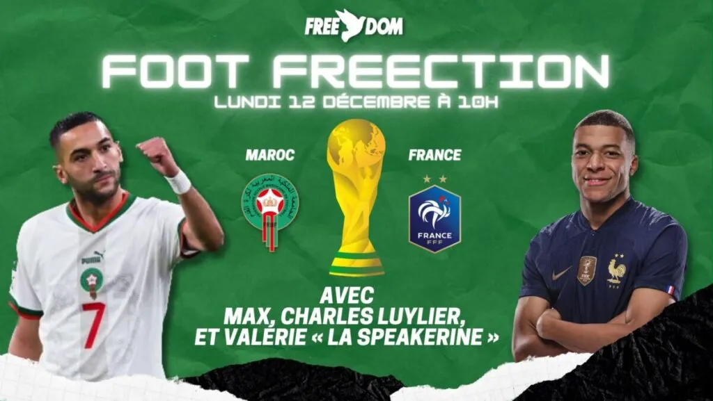 Max, Charles Luylier, et Valérie « la speakerine » ont accueilli ce lundi 12 décembre à 10h, les auditeurs pour un « FOOT FREECTION » avant le match France vs Maroc qui aura lieu ce mercredi 14 décembre 2022 en demi-finales de