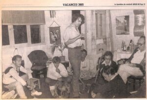 De gauche à droite : Bernard, Alain, Camille (avec le T-shirt « Coluche Président »), Clo (avec le T-shirt Free Dom) Carmen, Jacky, Margie et Solange au micro.