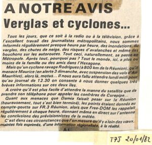 « Les points étaient donnés au compte-gouttes sur FR3 Réunion, alors que Free Dom les rappelait régulièrement à chaque heure, donnant même en direct sur l’antenne les conclusions des prévisionnistes de la météo. » (Télé 7 jours).