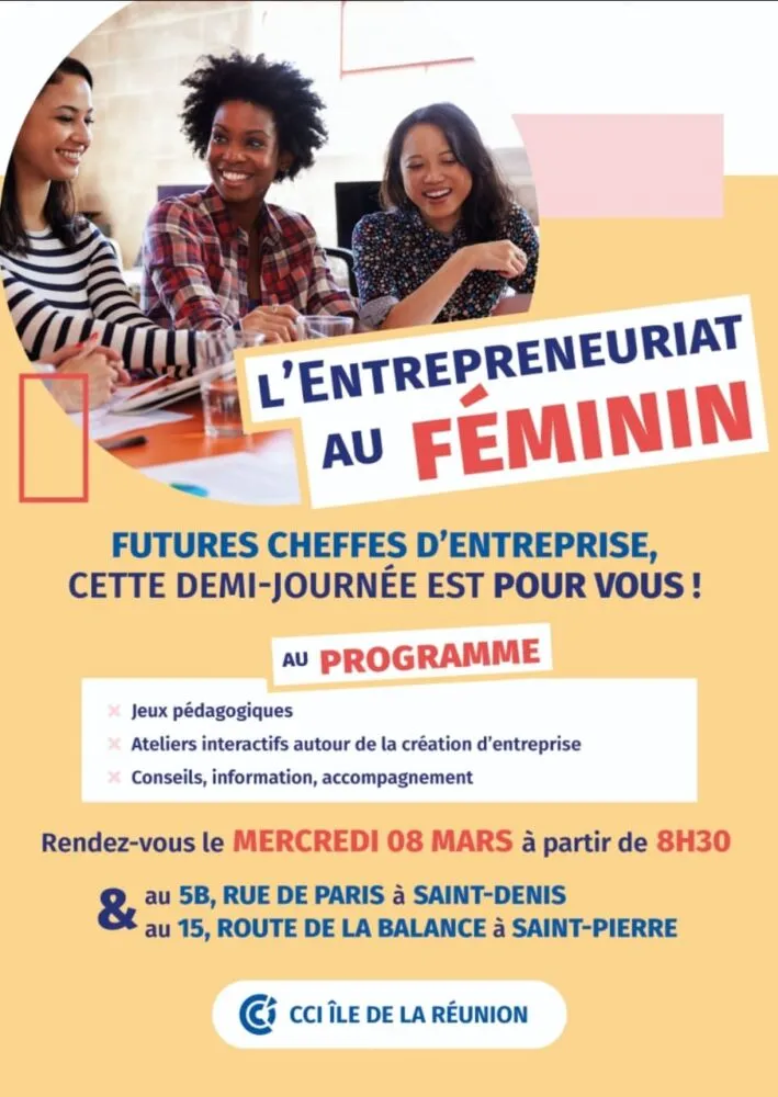 Dans le cadre de la journée internationale des droits des femmes ce mercredi 8 mars, la CCI de La Réunion organise une matinée découverte pour les femmes intéressées par l’entrepreneuriat, à l’espace entrepreneuriat nord et sud, ce mercredi 8 mars de 8h30