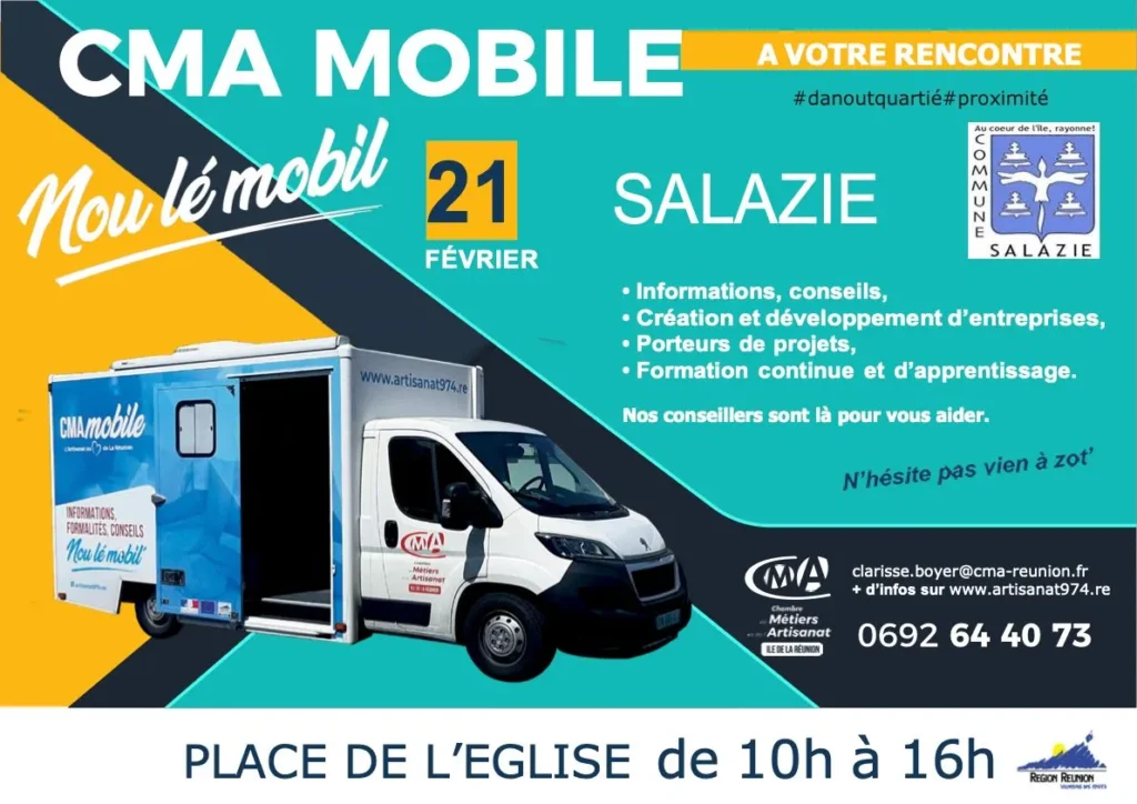 LA CMA MOBILE En route pour la ville de SALAZIE Nos conseillers sont là pour vous aider MARDI 21 FEVRIER DE 10H À 16H PLACE DE L’EGLISE N’hésitez pas venez nous retrouver #informations#conseils