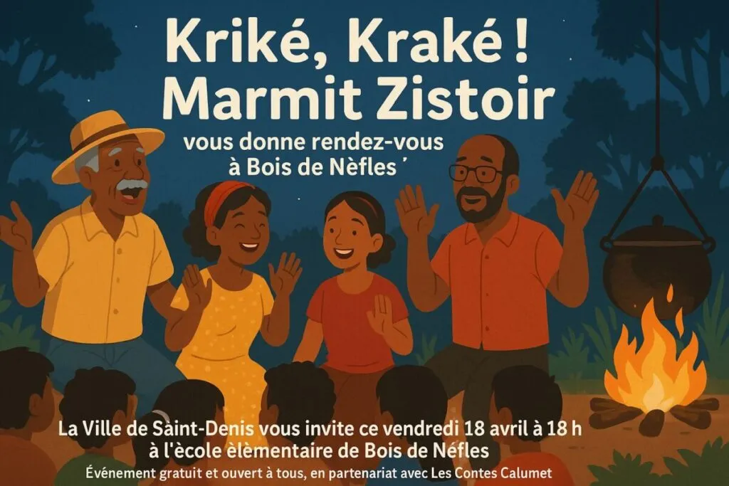 Kriké, kraké ! Marmit Zistoir vous donne rendez-vous à Bois de Nèfles ! La Ville de Saint-Denis vous invite à un moment de partage et de transmission ce vendredi 18 avril à 18h à l’école élémentaire de Bois de Nèfles, avec un
