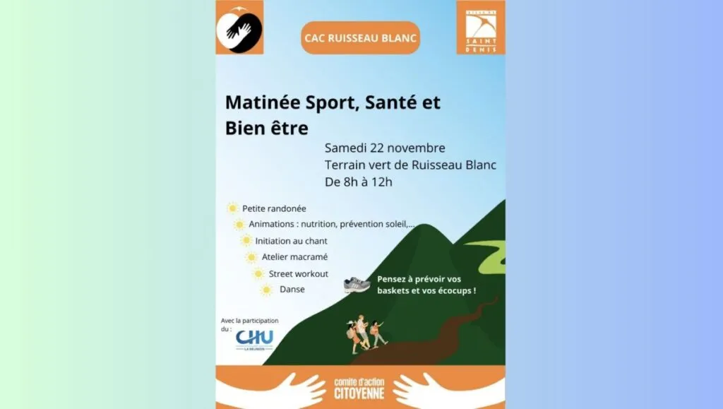 Le comité d’action citoyenne de Ruisseau Blanc organise ce samedi 22 novembre une matinée dédiée au sport, à la santé et au bien-être, sur le terrain vert de Ruisseau Blanc, de 8 h à 12 h.