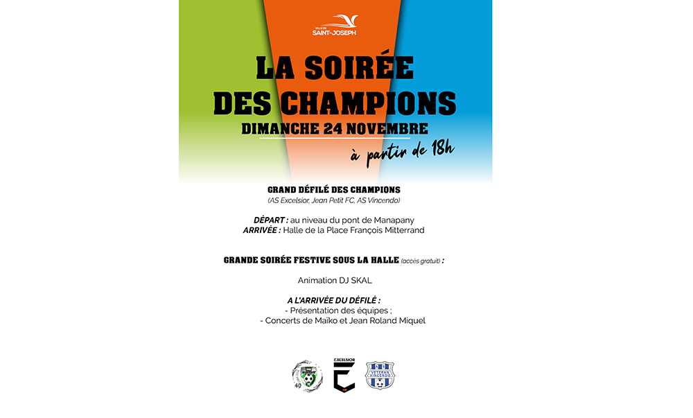 Saint-Joseph fête ses champions ! Le dimanche 24 novembre Saint-Joseph met à l’honneur ses footballeurs champions. L’AS Excelsior, le Jean-Petit FC et l’AS Vétéran Vincendo vous invitent à fêter avec eux leurs titres de champion ! A partir de 18h :