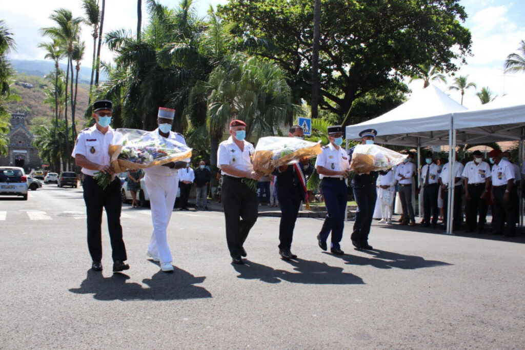 Bruno Domen, Maire de Saint-Leu, aux côtés des élus du Conseil municipal, de Jean-Pierre Cadiergues le Président de l’association des anciens combattants de Saint-Leu, du Lieutenant-colonel Ambroise PermalnaÏck, représentant des Forces Armées dans la Zone Sud de l’Océan Indien, du
