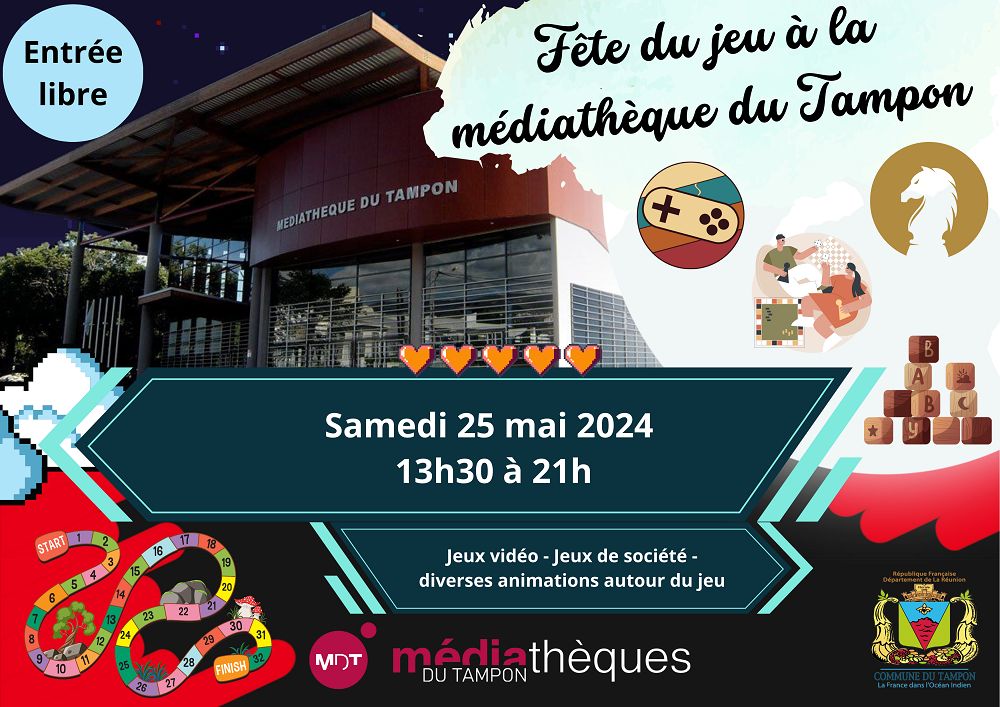 Ce samedi 25 mai, à l’occasion de la 24ème édition de la Fête mondiale du jeu, la médiathèque du Tampon centre-ville ouvre ses portes au public de 13h30 à 21h exceptionnellement !