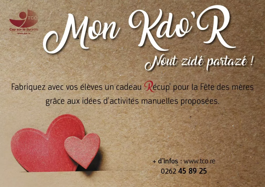Enseignants, c’est bientôt la fête des mères. Vous êtes à la recherche d’une idée cadeau originale à faire avec vos élèves ? Le TCO lance son opération Mon Kdo’R « Fête des mères ». Le principe est simple : Réalisez vos cadeaux