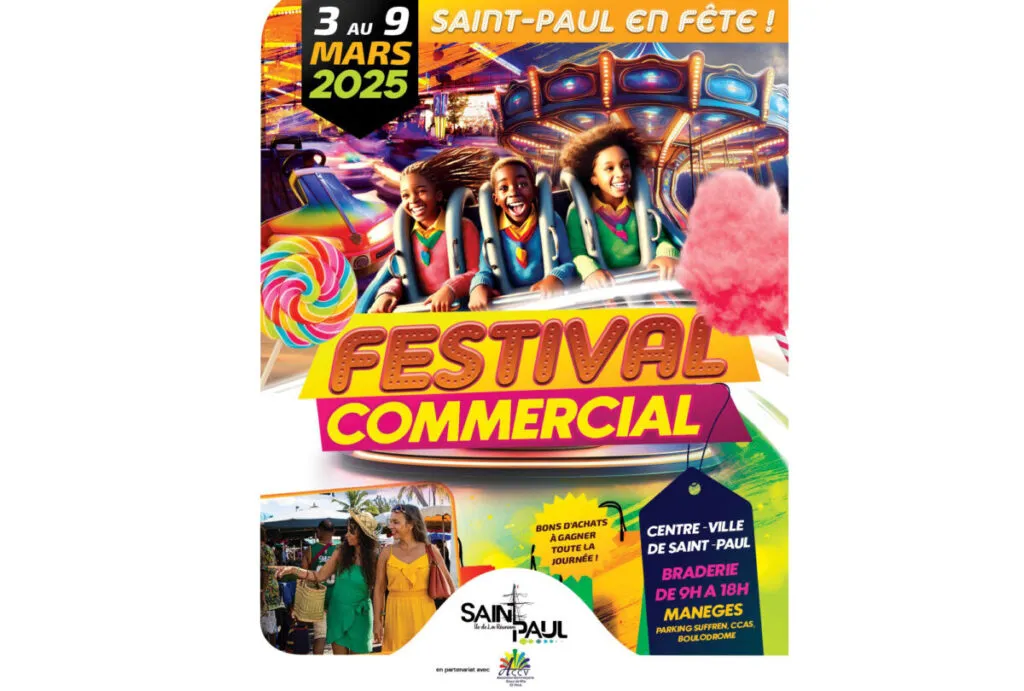 Le centre-ville de Saint-Paul accueille le Festival Commercial du 3 au 9 mars 2025. Une semaine de bonnes affaires avec une grande braderie de 9h à 18h. Des manèges seront installés aux parkings Suffren, CCAS et Boulodrome pour une ambiance