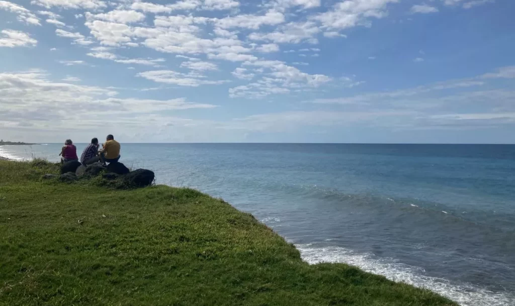 Un bel après-midi à Champ Borne, Saint-André. Les baleines s’y donnent en spectacle. Les visiteurs peuvent les apercevoir de loin, au large. Ils sont plusieurs dans l’eau. De nombreuses personnes se rendent sur place pour admirer ce beau spectacle et pour