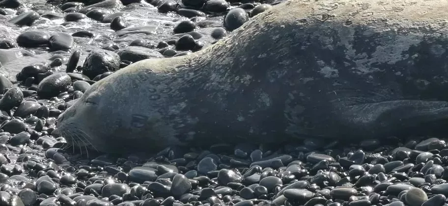 Sur la route du littoral au niveau de la Grande Chaloupe, un éléphant de mer du sud, femelle, jeune car la taille adulte de cet animal peut aller de 2,70 à 3 mètres pour un poids 800 kg maximum, ce