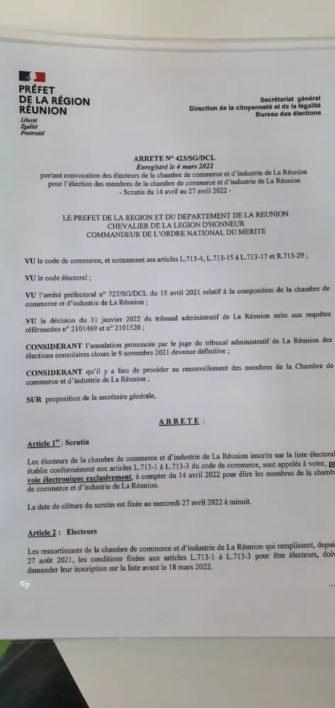 Les électeurs de la chambre de commerce et d’industrie de La Réunion sont appelés à voter par voie électronique exclusivement, à compter du 14 avril 2022, pour élire les 40 membres de la chambre de commerce et d’industrie.
