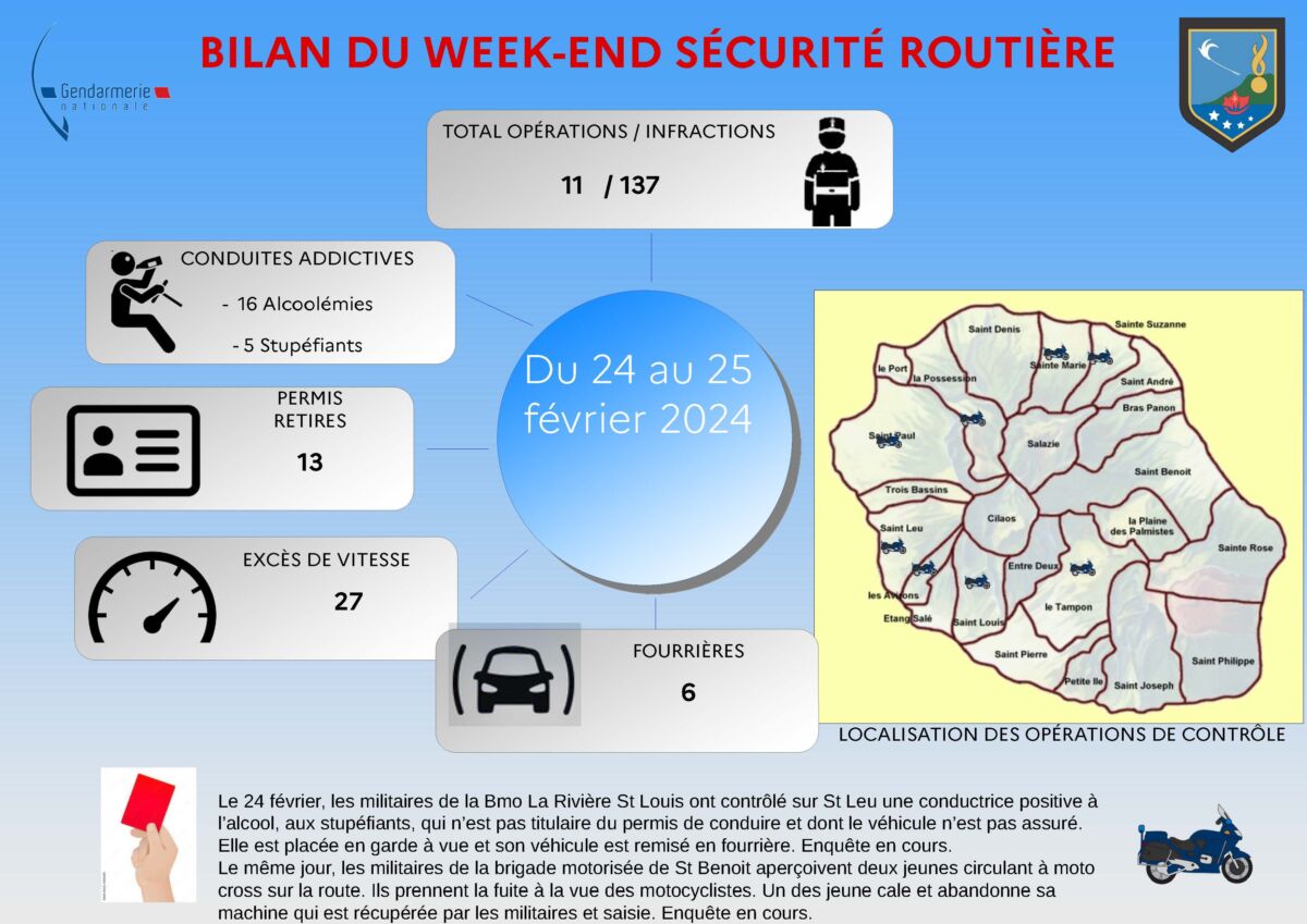 Durant le week-end du 23 au 25 février 2024, la Direction Territoriale de Police Nationale de La Réunion a mené 30 opérations de sécurisation et de sécurité routière dans le département. Ces actions ont permis de détecter un total de 162 infractions, parmi lesquelles 25 étaient considérées comme des délits. Les types d’infractions relevées étaient les suivants :