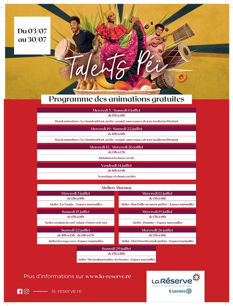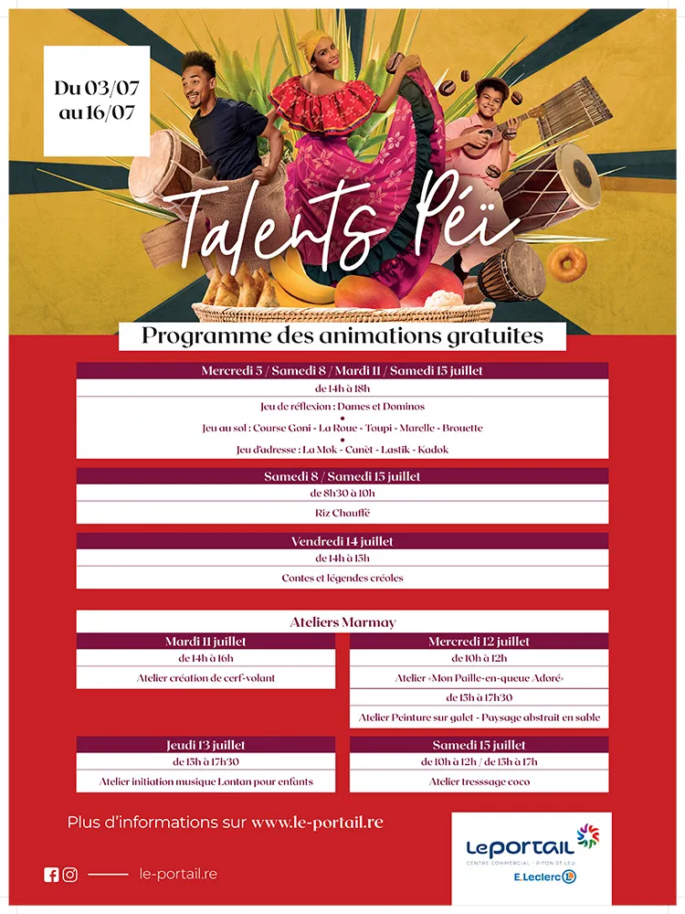 La Réunion regorge de talents. Que ce soit dans l’agriculture, l’artisanat, l’industrie ou la culture, notre île est un inépuisable terreau de créativité. Ce sont tous ces talents créatifs que le Mouvement E.Leclerc Réunion souhaite mettre à l’honneur avec la manifestation « Talent péï » organisée du 3 au 16 juillet. Une manifestation dont l’ambition est de célébrer et valoriser la production locale sous toutes ses formes.