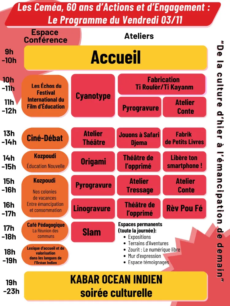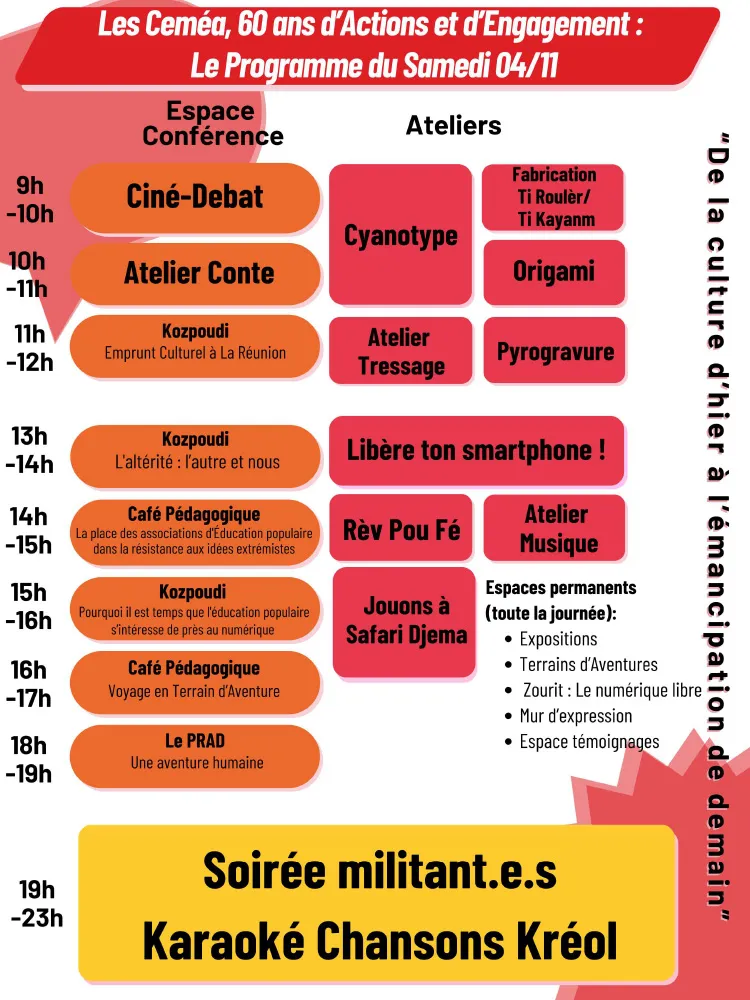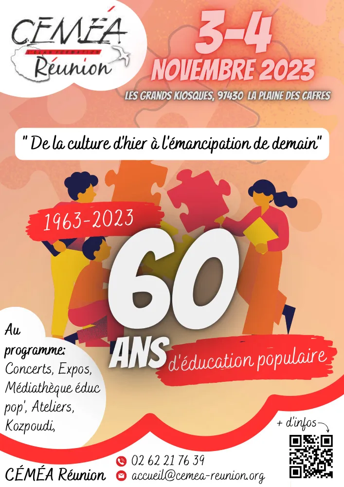 Les CEMÉA Réunion (Centres d’Entraînements aux Méthodes d’Éducation Active) organisent un événement régional anniversaire sur « 60ans d’actions d’Éducation Populaire à La Réunion» le 3 et 4 novembre 2023 au Grands kiosques.