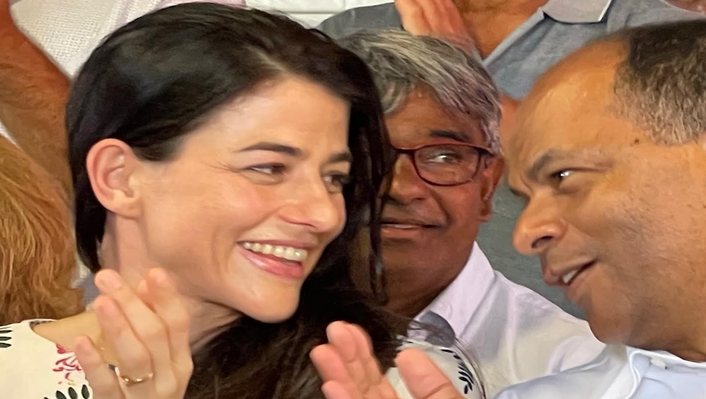 La Mauricienne Joanna Bérenger, ministre adjointe de l’Environnement, nommée par son papa Paul, vice-Premier ministre, qui était l’invitée des forces progressistes de la Réunion à leur grand rassemblement. Ici, avec Emmanuel Séraphin, maire de Saint-Paul et secrétaire général de PLR. (Crédit photo : Y.M)