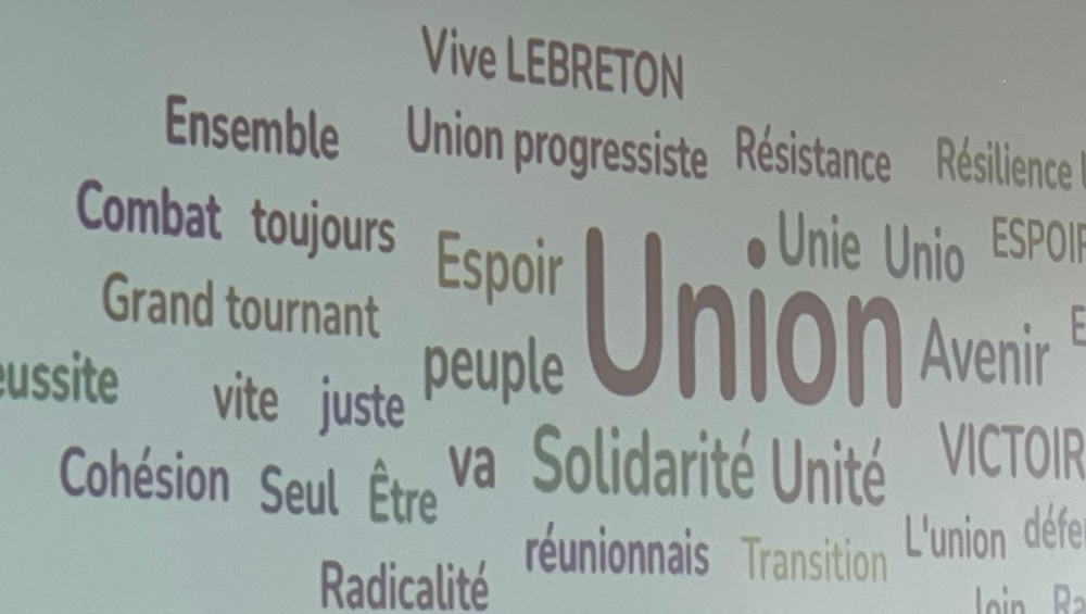 Avouez qu’elle n’est pas mal aussi celle-là ! C’était lors du grand rassemblement des forces progressistes, dimanche dernier, au Barachois. Parmi les mots clés projetés sur écran géant dans la salle vous noterez le « Vive Lebreton » !